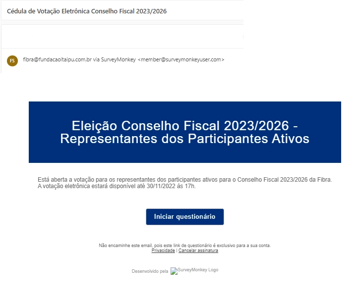 OBS: Caso não localize este e-mail na sua caixa de entrada, verifique se não está no spam. O remetente da mensagem será fibra@fundacaoitaipu.com.br e a plataforma utilizada, Survey Monkey.